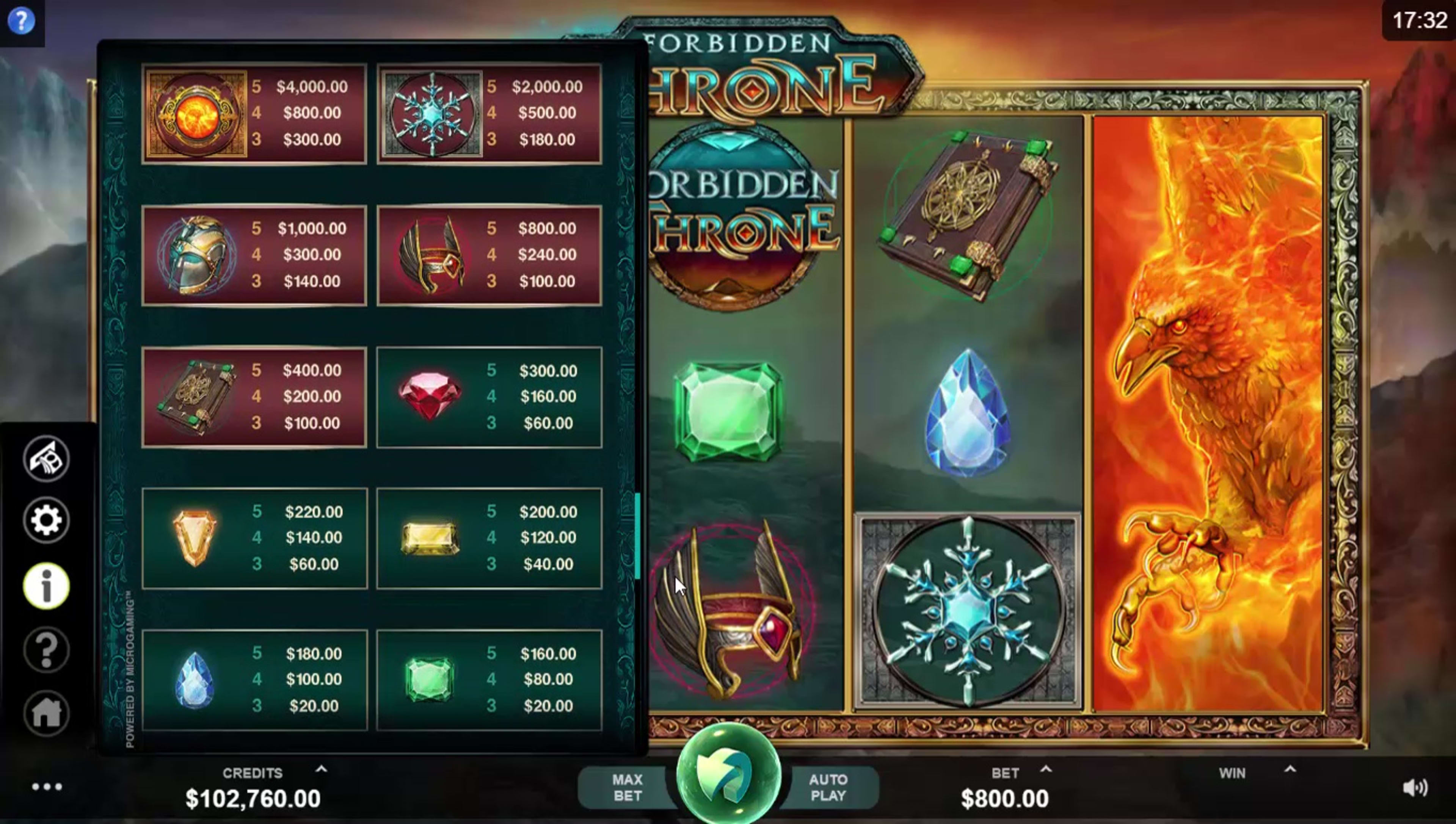 De inzet omvat altijd 40 lijnen, zoals ik al eerder zei, dus de enige beslissing die de speler kan nemen is als het gaat om het aantal munten dat per lijn wordt gebruikt en hun waarde. Je kunt voor elk van deze lijnen maximaal 10 munten gebruiken, waarbij de coupures maximaal $ 2 kunnen bedragen. Het volledige inzetbereik in Forbidden Throne loopt van $0,40 tot $800, dus er is genoeg voor iedereen om een waarde te vinden waar hij of zij zich prettig bij voelt.