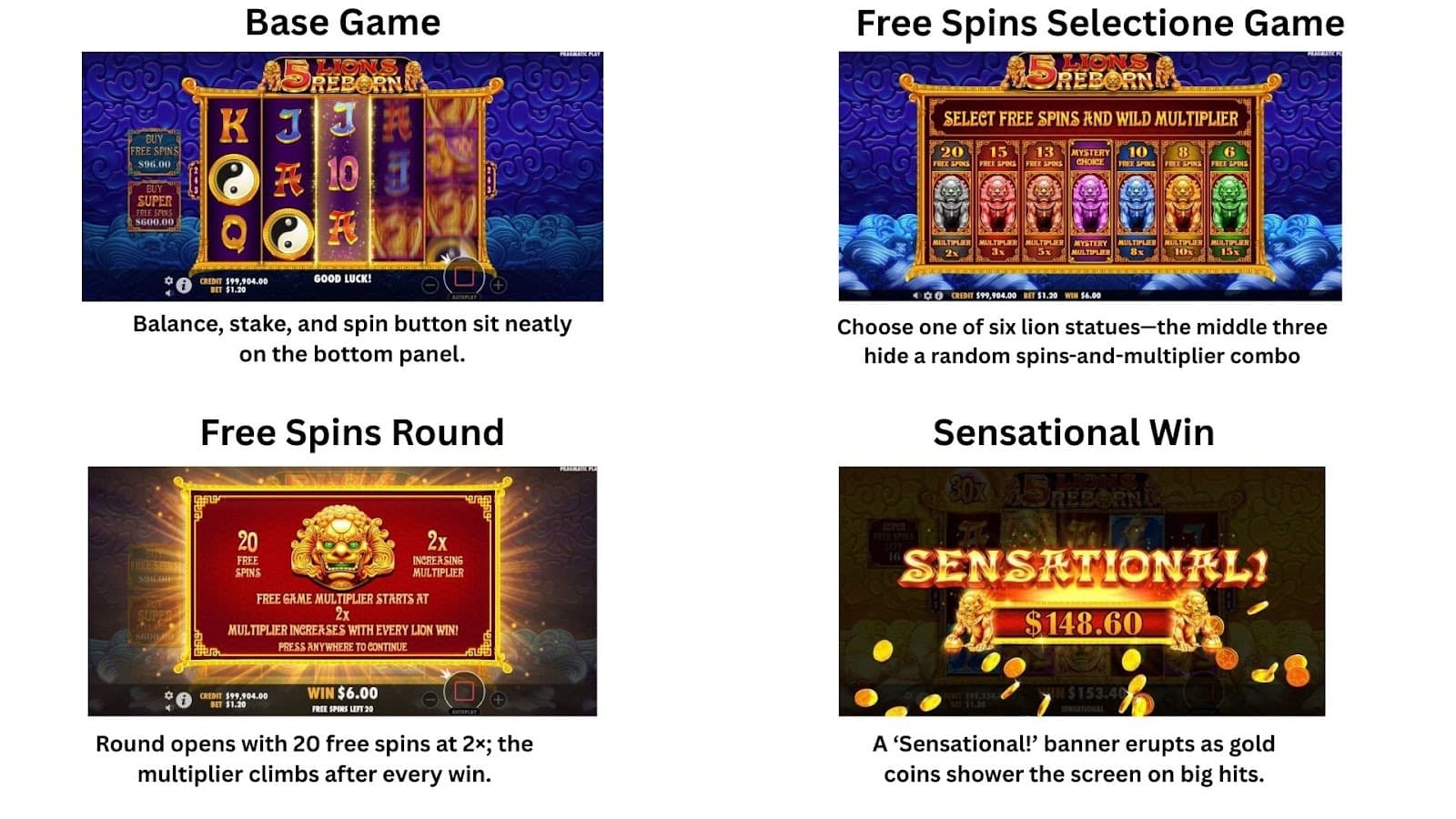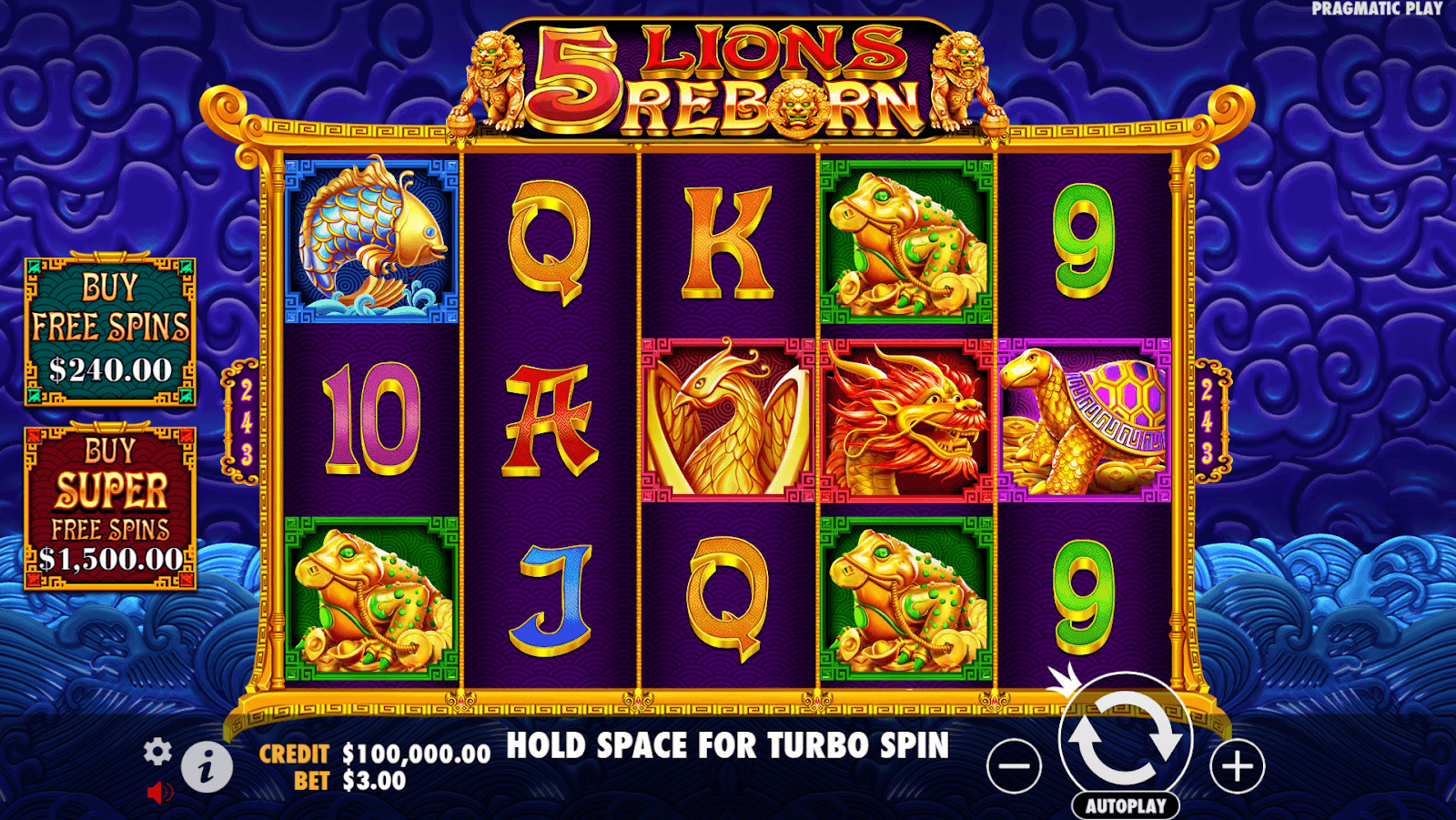 5 Lions Reborn bevat rijke, gedetailleerde afbeeldingen met als middelpunt een jadetempel op de achtergrond, waar symbolen van feniks, schildpadden en koi schitteren in sierlijke gouden filigraan. Subtiele deeltjesvlammen en lichte uitbarstingen zorgen voor een gepolijst, dynamisch gevoel zonder de traditionele Chinese esthetiek te overheersen.