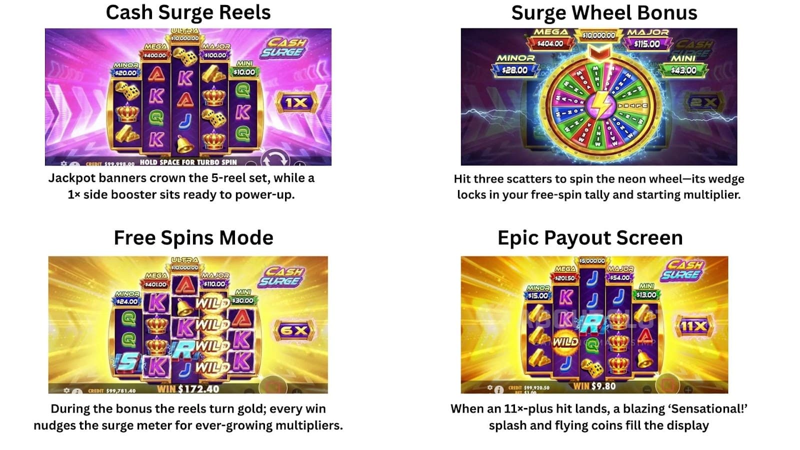 - SURGE gratis spins — verzamel de letters S-U-R-G-E om vier spins vrij te spelen terwijl alle huidige progressieven zijn vergrendeld; extra letters voegen +1 spin toe en de bliksem blijft de prijzen verhogen.